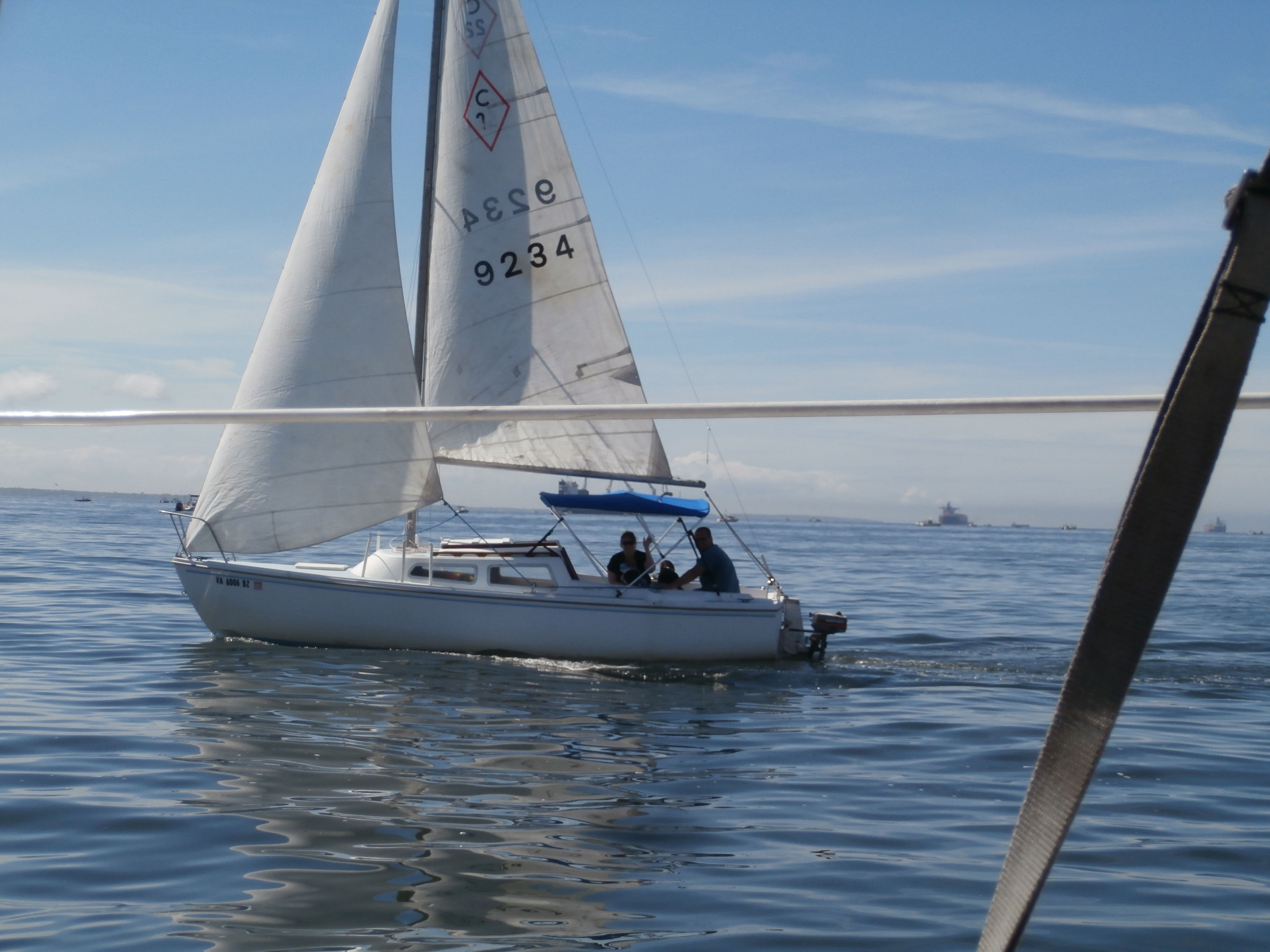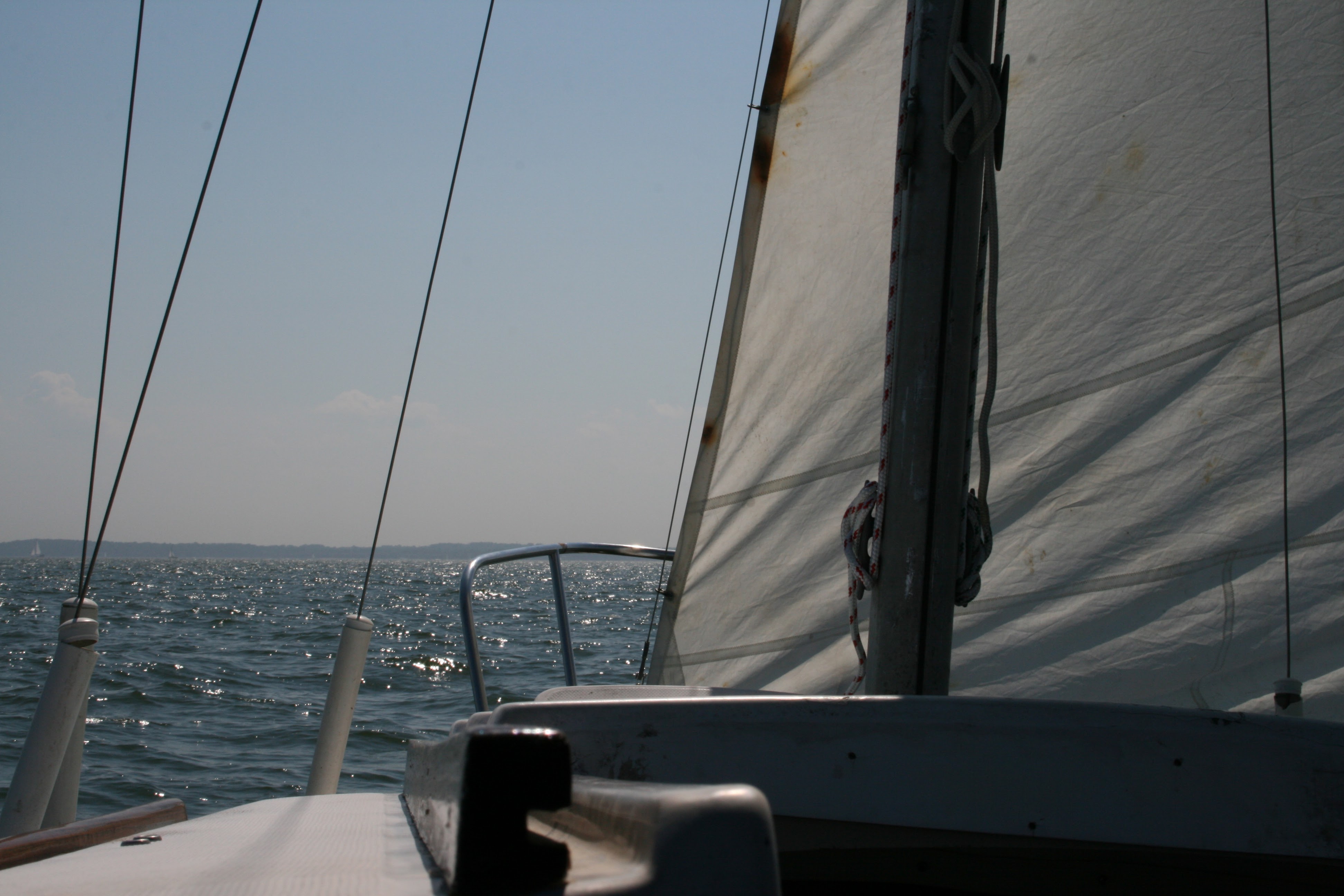 The following morning, we looked up the latest weather report. There was no wind in the forecast until evening, and that wind was leading a storm front to the Chesapeake Bay. Our entire group made the decision for us all to head back to port. We borrowed a 2HP dinghy motor from one of them and had an uneventful sail on a nearly glass smooth bay back to Sandy Point.